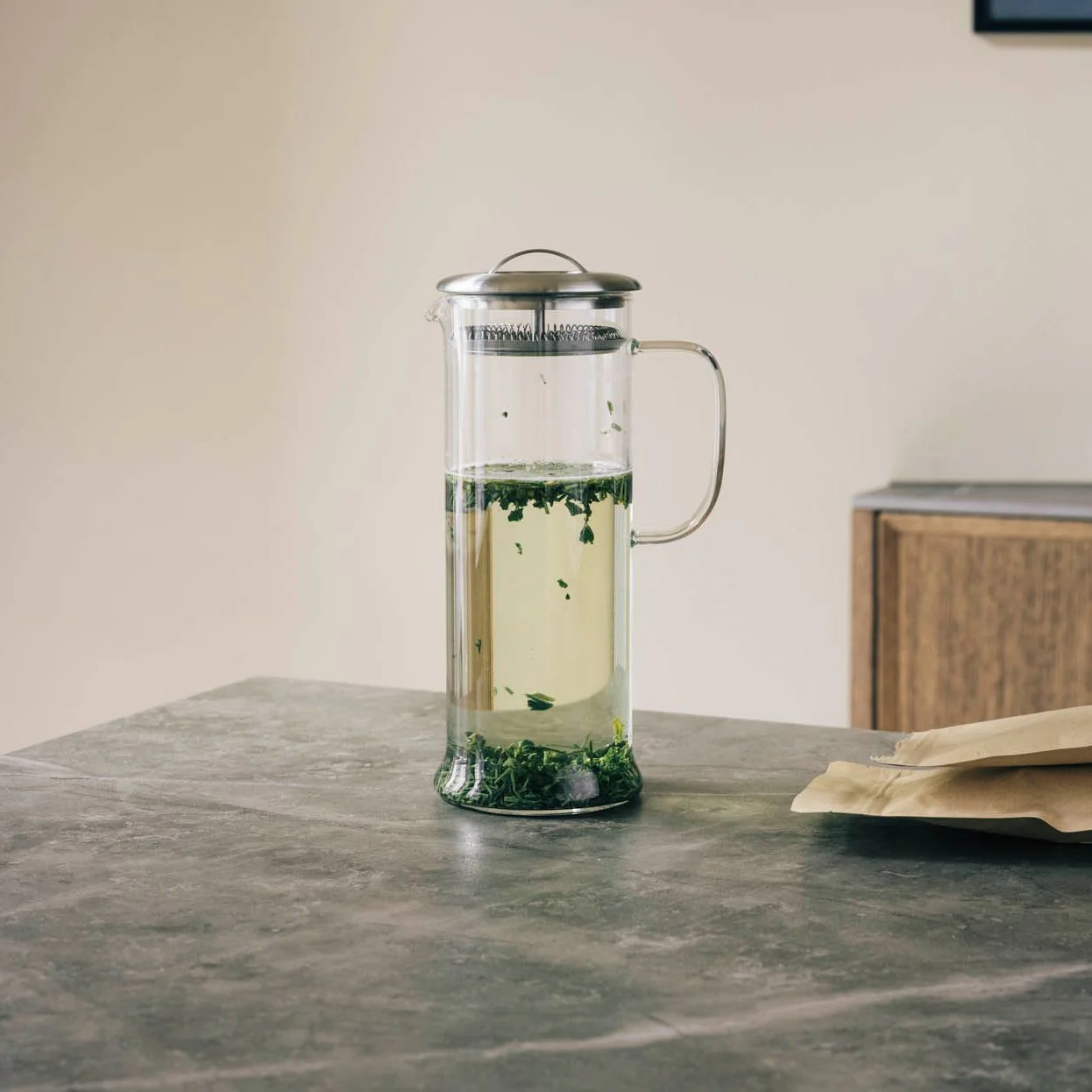 Mit kompaktem Design, das in einer Kühlschranktür Platz findet, und großer Füllmenge eignet sich diese Glaskanne aus Borosilikatglas sowohl für heißen Tee als auch für sommerliche Cold-Brew-Aufgüsse. Ein feinmaschiges, in den Deckel integriertes Edelstahlsieb hält die Blätter dabei zuverlässig in der Kanne.